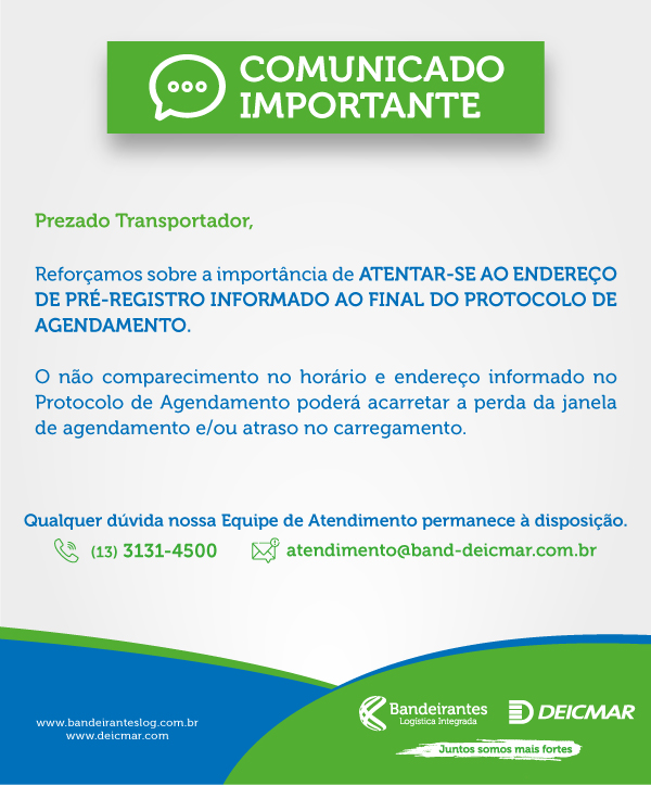 ATENÇÃO TRANSPORTADORA | ENDEREÇO PRÉ-REGISTRO